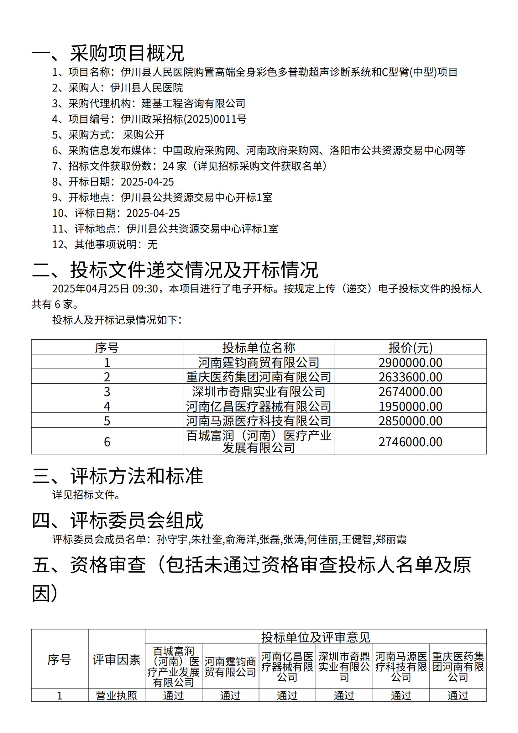 伊川縣人民醫院購置高端全身彩色多普勒超聲診斷系統和C 型臂(中型)項目評標報告